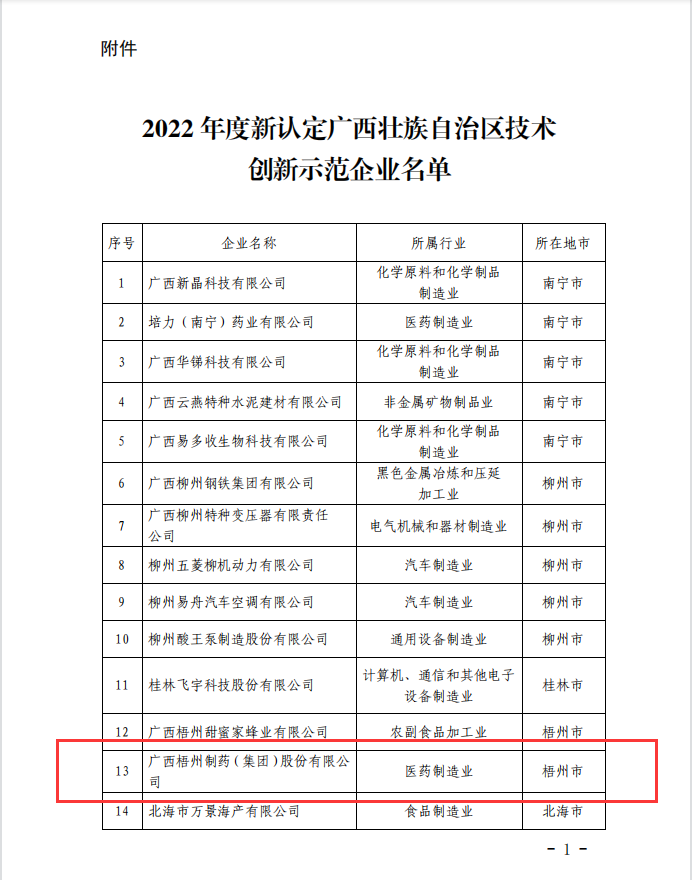 近日,广西壮族自治区工业和信息化厅发布《自治区工业和信息化厅 自治区财政厅关于公布2022年度新认定广西壮族自治区技术创新示范企业名单的通知》,梧州制药榜上有名,获评为2022年度“广西壮族自治区技术创新示范企业”。