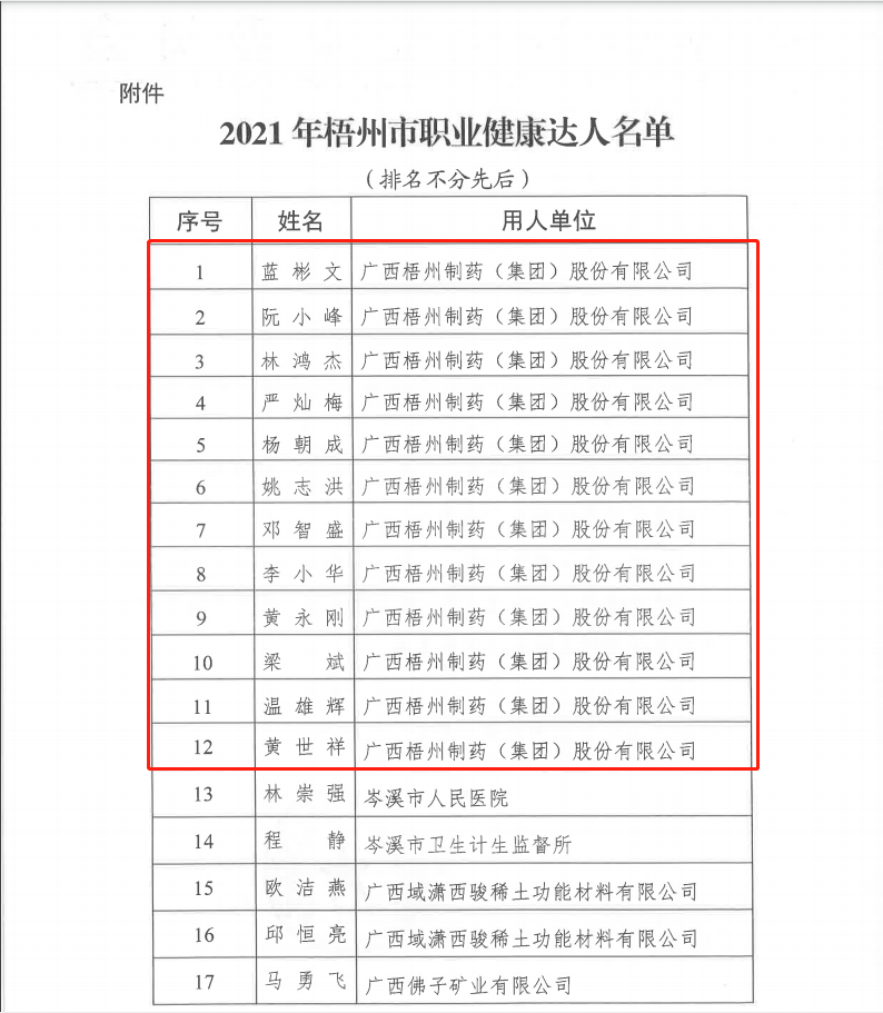 近日,梧州市卫生健康委公布2021年度梧州市职业健康达人评选结果,梧州制药12名职工获得“职业健康达人”称号。
