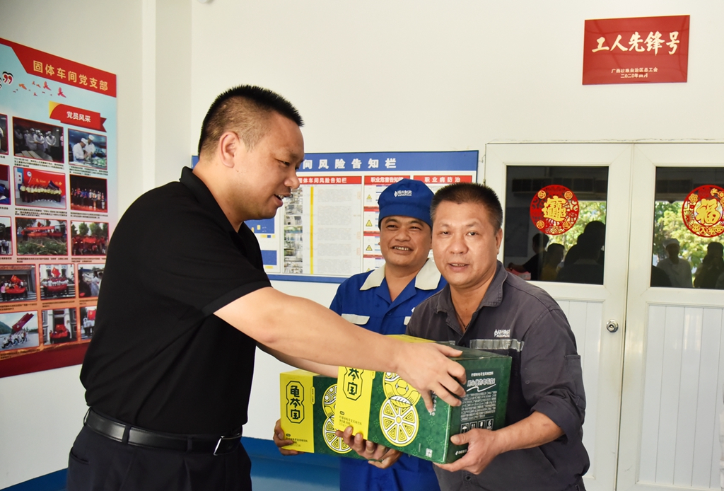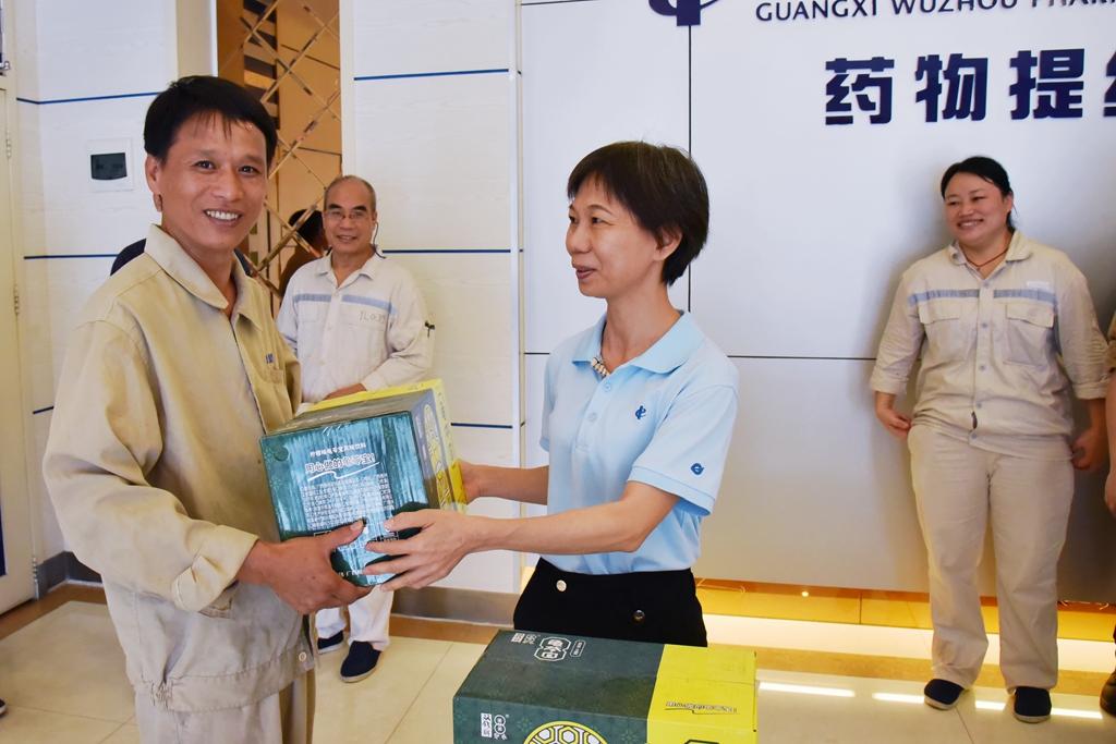 “天气这么热,大家辛苦了!”“注意自我保护,记得多喝水!”“岗位都备有防中暑药品,主任们要留意职工的身体状态, 合理安排休息。”近日,梧州制药领导班子分别带上清凉饮品,到各车间慰问奋战在高温岗位的职工,声声叮咛,让职工们在盛夏中感受到了阵阵清凉。