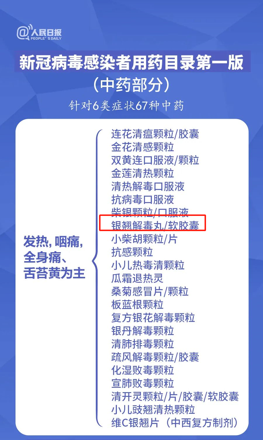 在近日发布的《新冠病毒感染者用药目录第一版》中,银翘解毒丸入列,同样也是以连翘和金银花作为君药,同样主治风热感冒,与连花清瘟制剂一样可用于治疗发热头痛,咳嗽,咽喉疼痛等症候。