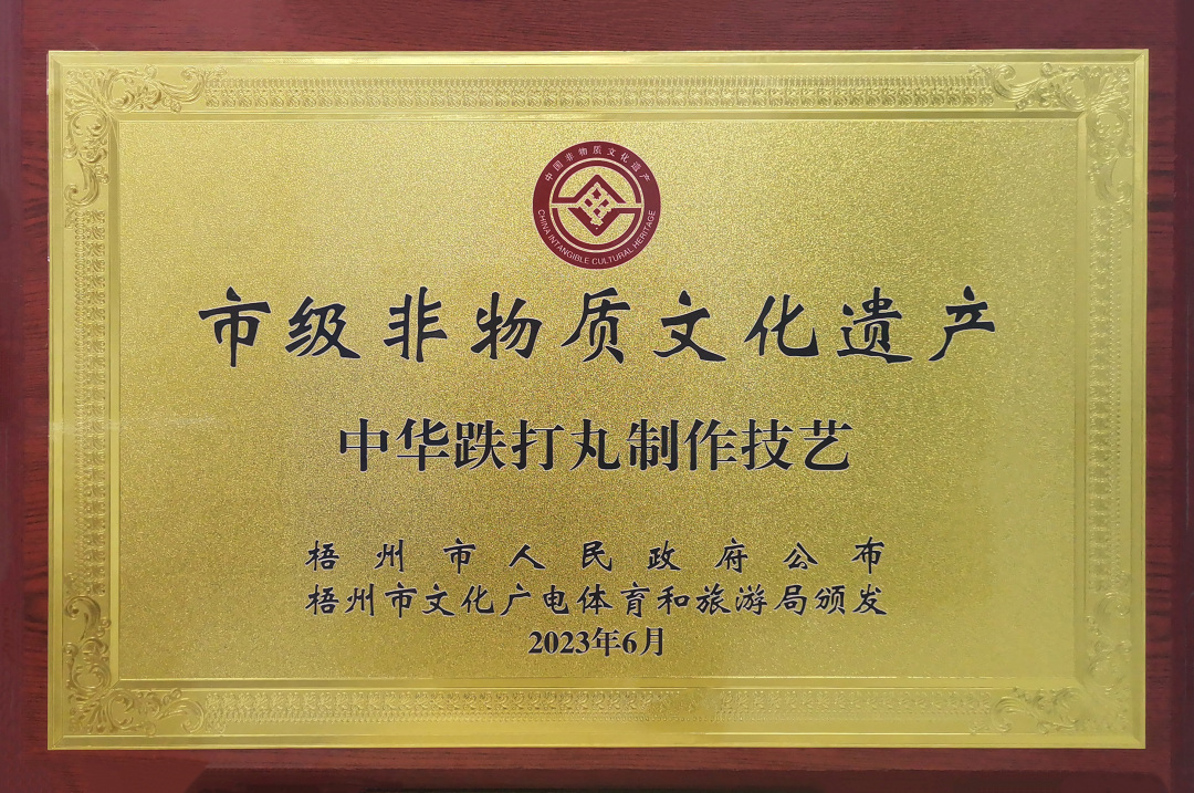 近日,在梧州市文化广电体育和旅游局主办的2023年“文化和自然遗产日”梧州市主会场宣传展示活动中,梧州制药中华跌打丸制作技艺获授牌匾,成功入选梧州市第六批非物质文化遗产代表性项目名录。