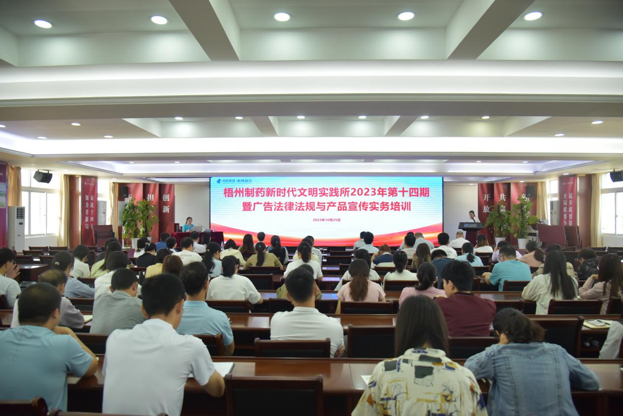 近日,梧州制药在公司办公楼六楼一号会议室举办新时代文明实践所2023年第十四期暨广告法律法规与产品宣传实务培训,特邀梧州市市场监督管理局广告监督管理科科长谢艳娟前来授课,梧州制药各部门、各车间,以及集团公司和各兄弟企业相关人员共计90余人参加培训。