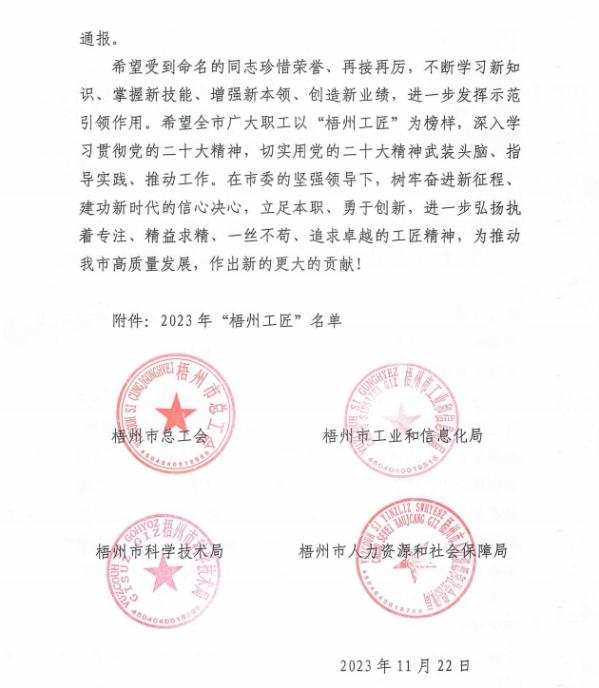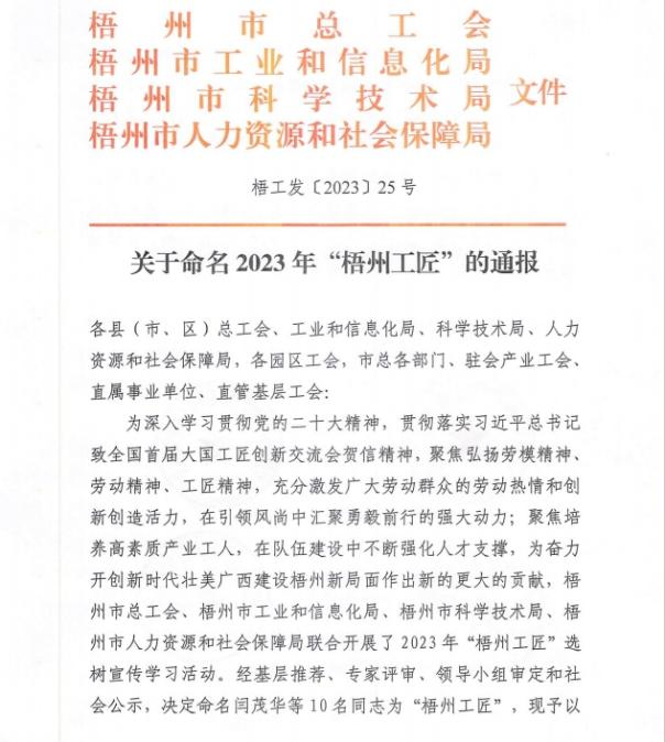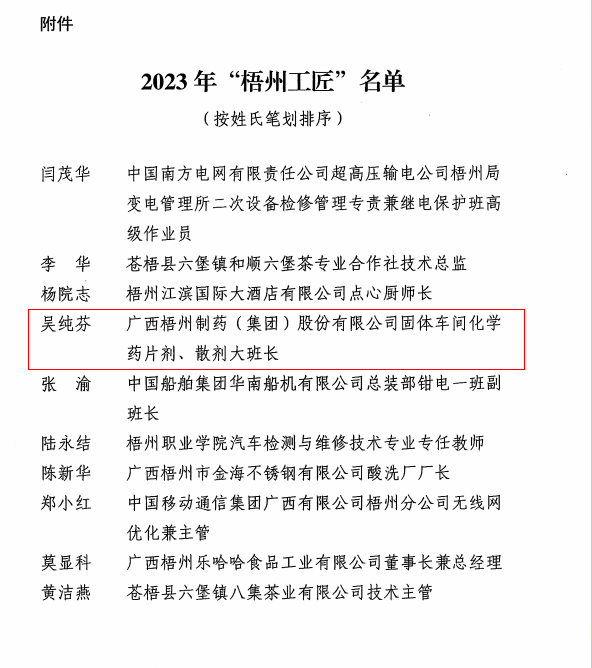 近日,梧州市总工会、梧州市工业和信息化局、梧州市科学技术局、梧州市人力资源和社会保障局联合发布《关于命名2023年“梧州工匠”的通报》,梧州市有10名同志被选树为“梧州工匠”,其中,梧州制药固体车间化吴纯芬获此殊荣。