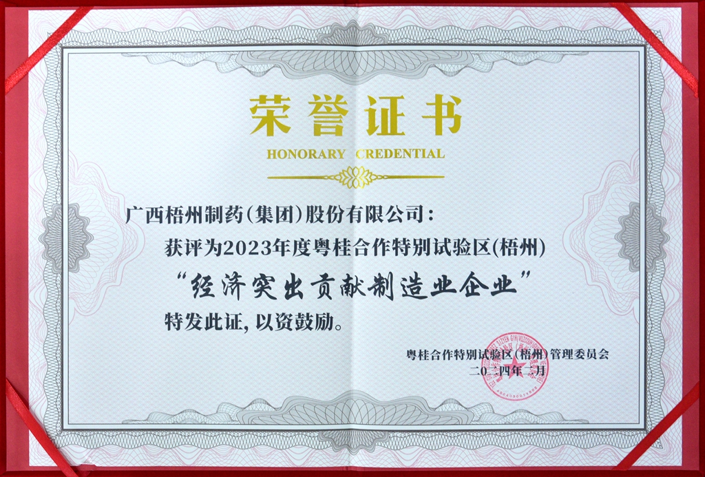 广西梧州制药(集团)股份有限公司获评为2023年度粤桂合作特别试验区(梧州)经济突出贡献制造业企业