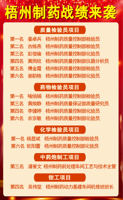 其中,姜卓兵、古炼燕、彭俊瑜、黄雨欣、傅金霞、谢韵艳包揽了质量检验员项目的前六名殊荣;喻俏娟、黄焕静、李健婷、农宗敏在药物检验员项目中分别荣获第一、第三、第四、第六名;杨显斌、欧阳蕾在化学检验员项目中分别荣获第一和第六名;潘誉文在中药炮制工项目荣获第三名;吴伟坚在钳工项目中荣获第四名。