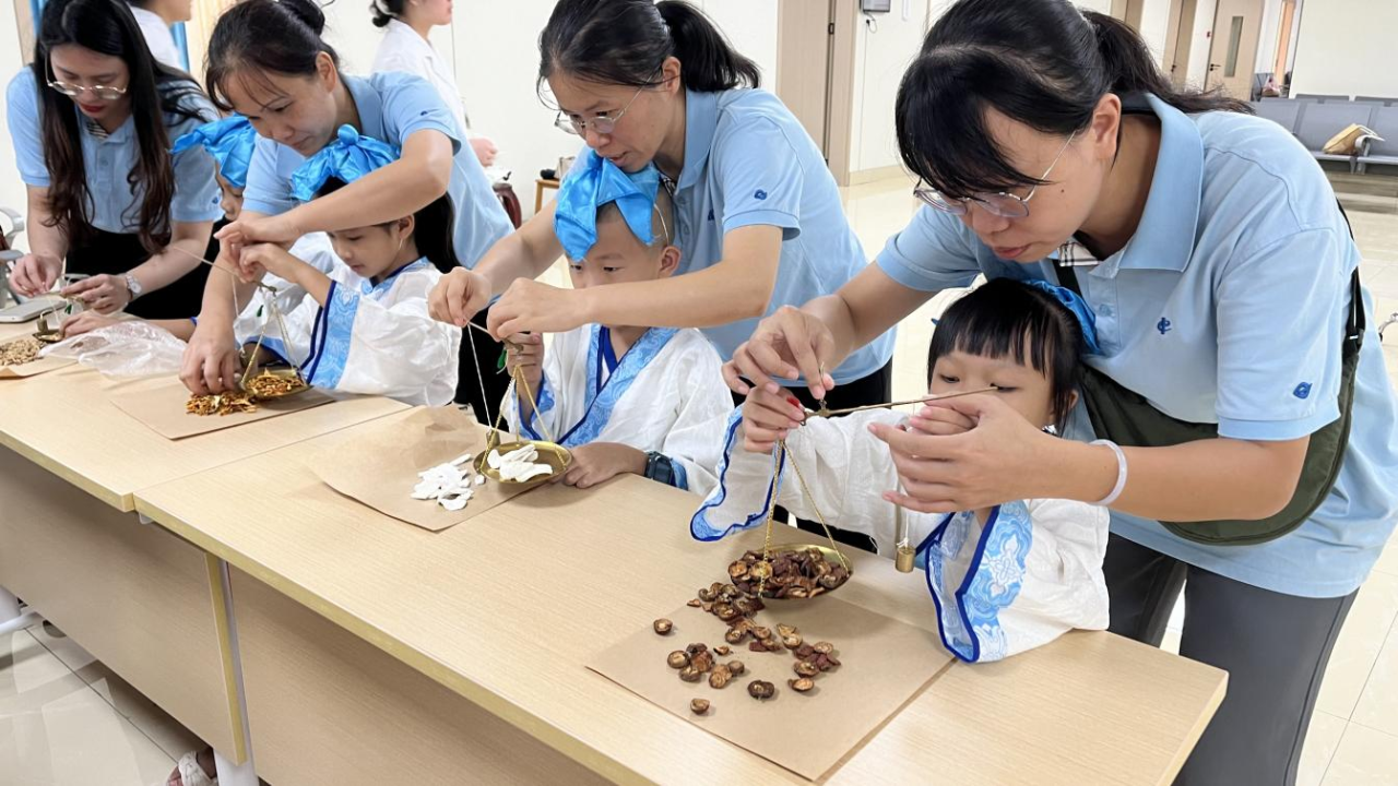 “党参、黄芪、蜜枣...”气味各异的中药材一排排地摆放在桌上,孩子们好奇地凑近闻、伸长脖子仔细端详。在现场中医师的指导下,家长们手把手带着孩子学习中药材的称量方法,“爸爸、妈妈,你看你看!我学会称中药了!”孩子们将戥称高高举起,自豪地向爸爸妈妈们展示。