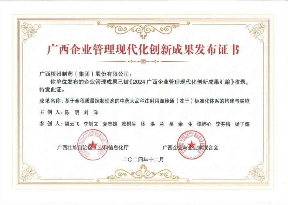 近日,由自治区工业和信息化厅、广西企业与企业家联合会联合举办的2024广西企业管理创新现场交流活动发布了2024广西企业管理现代化创新成果汇编名录,此次全区共有54家企业发布了73项企业管理现代化创新成果。梧州制药申报的《基于全程质量控制理念的中药大品种注射用血栓通(冻干)标准化体系的构建与实施》成果成功入选。