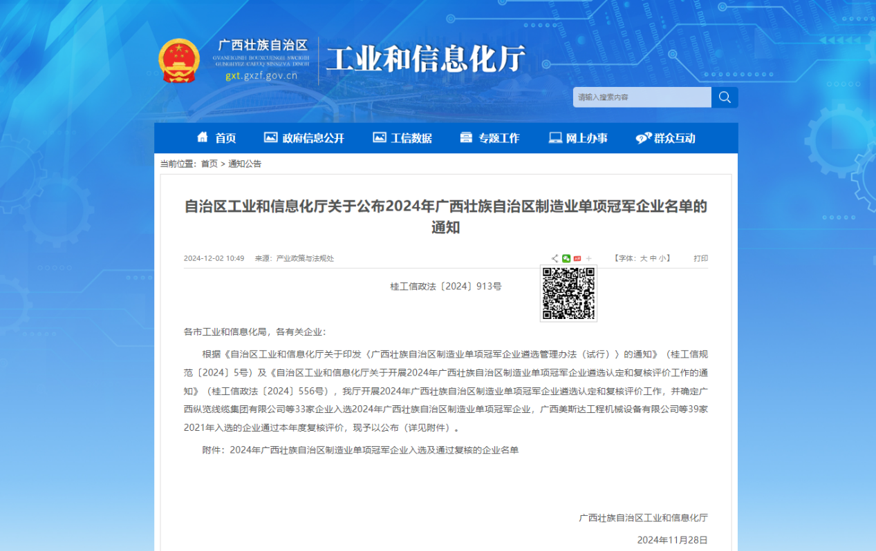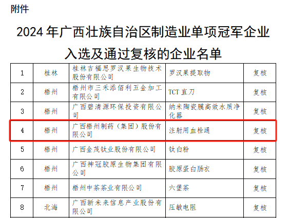 近日,广西壮族自治区工业和信息化厅公布2024年广西壮族自治区制造业单项冠军企业名单,梧州制药凭借着冠军产品注射用血栓通卓越的技术能力和市场竞争力,顺利通过了每三年一次的复核评价。