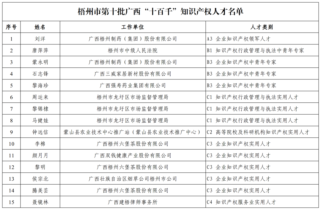 此次入选第十批广西“十百千”知识产权人才名单,不仅是对两名同志在知识产权领域所取得成绩的肯定,更是对梧州制药近年来深入贯彻广西知识产权“十百千”人才工程建设要求,积极打造高素质专业化的知识产权人才队伍的认可和鼓励。