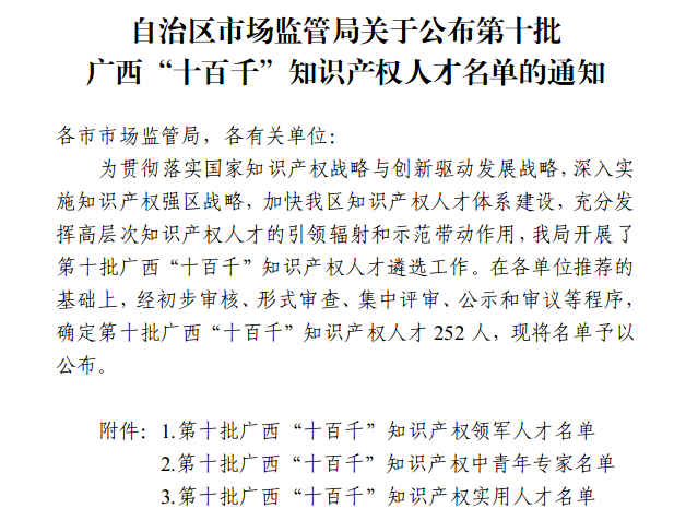 近日,自治区市场监管局公布第十批广西“十百千”知识产权人才名单,太阳成集团tyc9728副董事长、总经理刘洋同志获“A3企业知识领军人才”称号,药学事务部知识产权专员蒙永明同志获“B3 企业知识产权中青年专家”称号。