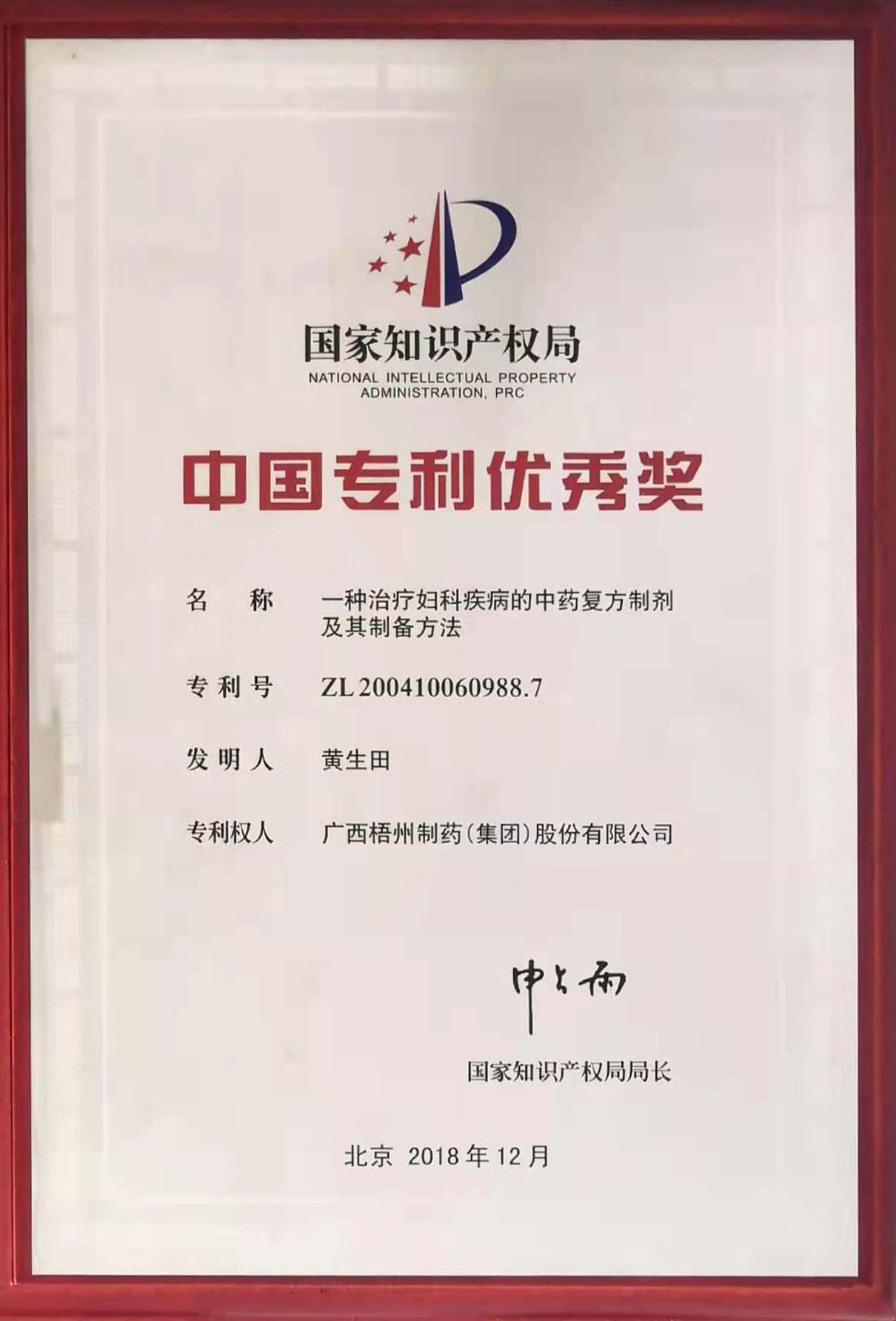 黄生田参与的《一种治疗妇科疾病的中药复方制剂及其制备方法》项目荣获中国专利优秀奖。