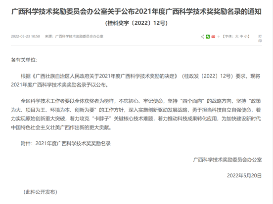近日,广西科学技术奖励委员会办公室发布《关于公布2021年度广西科学技术奖奖励名录的通知》(桂科奖字〔2022〕12号),2021年度广西科学技术奖揭晓,162项科技成果榜上有名,其中梧州制药与天津中医药大学、浙江大