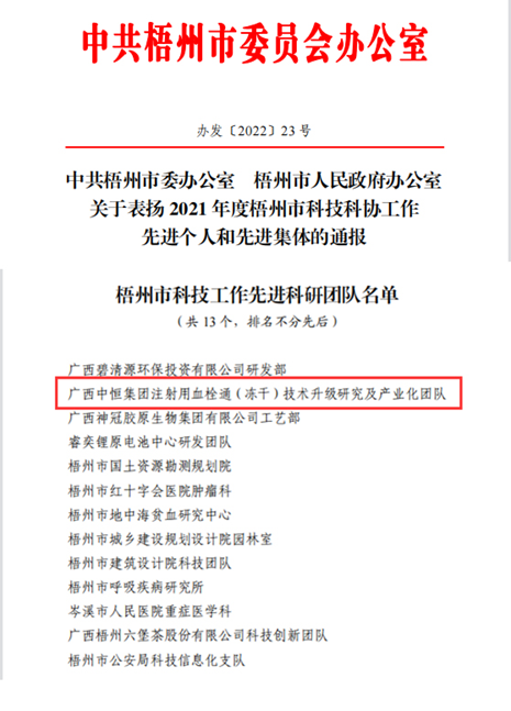 近日,中共梧州市委办公室、梧州市人民政府办公室发布《关于表扬 2021年度梧州市科技科协工作先进个人和先进集体的通报》,“注射用血栓通(冻干)技术升级研究及产业化团队”荣获“梧州市科技工作先进科研团队”称号。