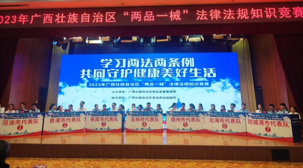 7月13日,由梧州制药员工代表——质量控制部吕金慧、质量保证部李佳霖与梧州市场监督管理局监管人员组成的梧州市代表队参加广西壮族自治区“两品一械”法律法规知识竞赛,凭借过硬的专业知识、迅速
