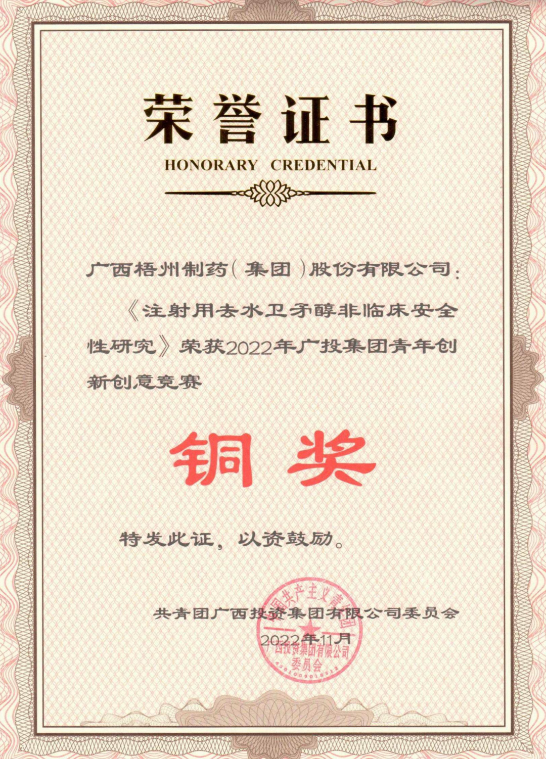 近日,由梧州制药质量保证部组成的梧州制药代表队——“质量卫士”队,凭借项目《注射用去水卫矛醇非临床安全性研究》获得2022年广投集团青年创新创意竞赛铜奖的表彰。本次竞赛共有16个项目最终入围决赛,通过视频会议的